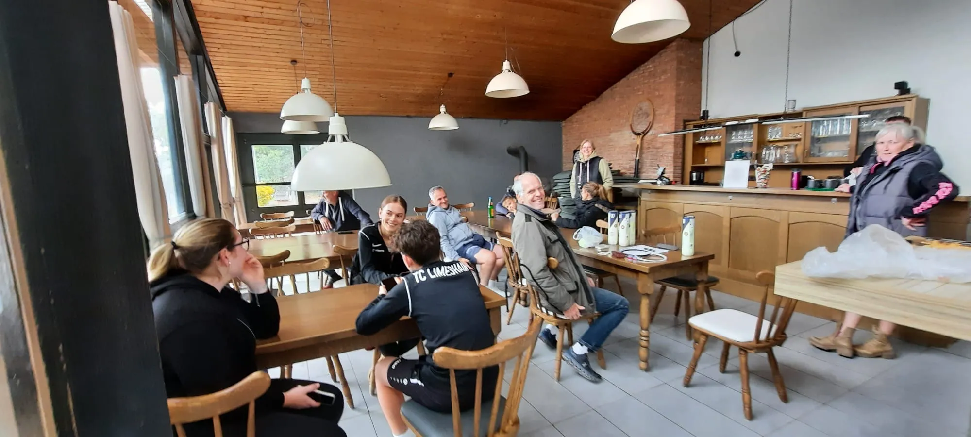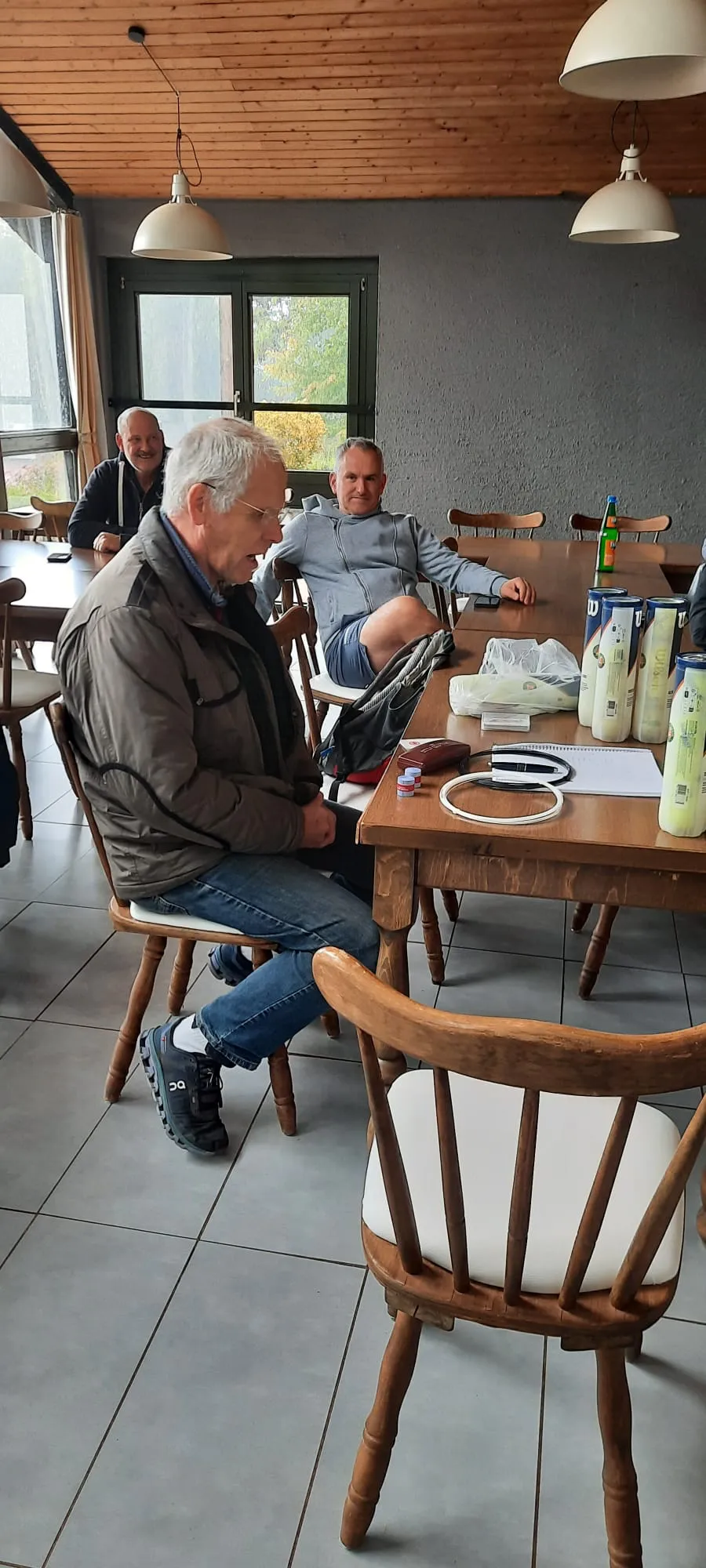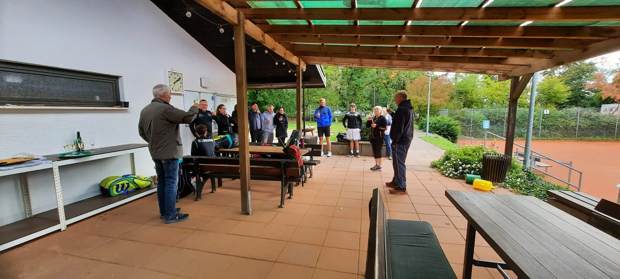 Nach einem kleinen Begrüßungsgetränk hat uns die Regenpause bei bester Laune drei Runden spielen lassen. Immerhin! 🥂 🎾 🥳
